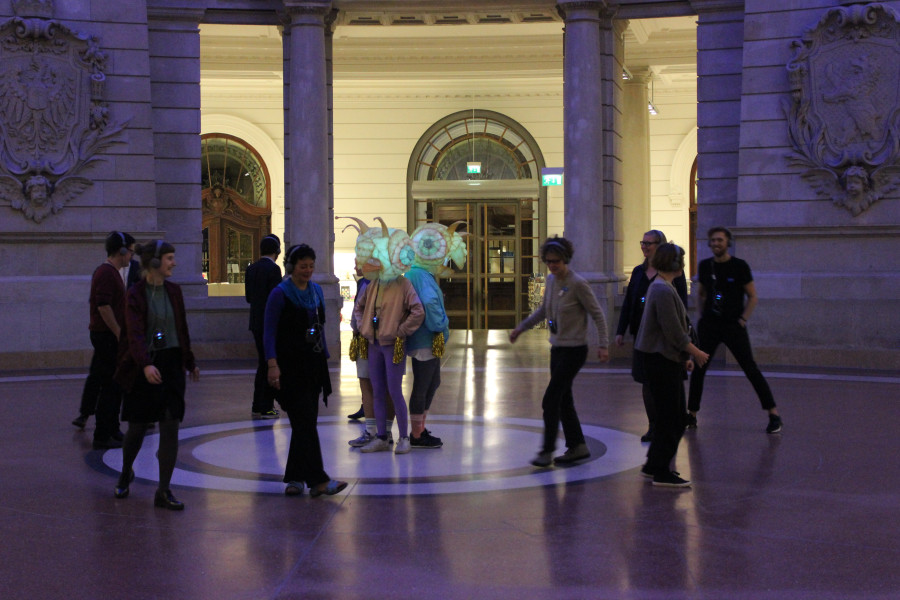 Käfern auf der Spur, die ihre Unterleibe erstrahlen lassen, wird das Publikum auf eine Nachtwanderung durch das Museum für Kommunikation geschickt.