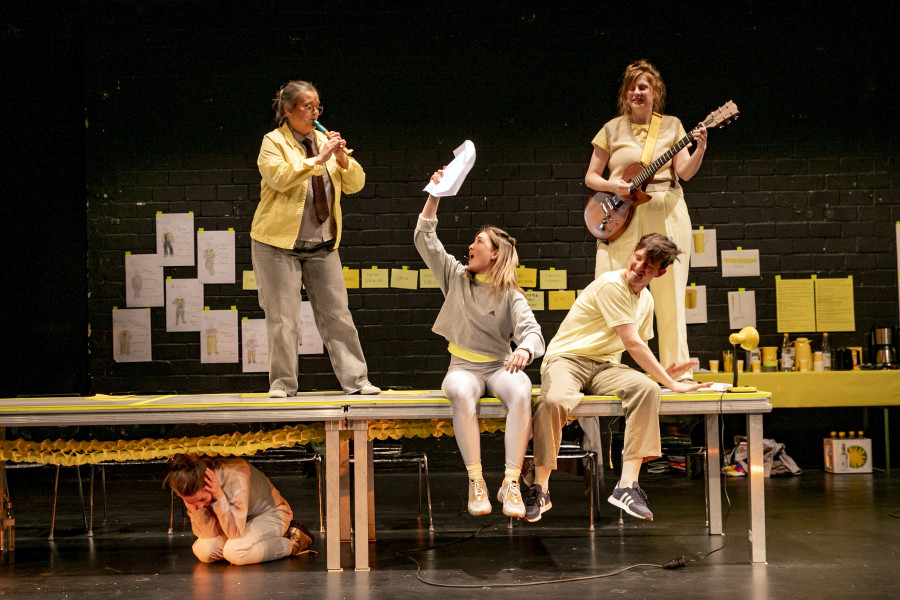 Glücklicherweise aber hat das Grips die Regie des Abends in die Hände des für Witz und Originalität bekannten Performerinnen-Kollektivs hannsjana gelegt, das einen schönen Twist erfindet: Die gesamte Jubiläumsfeier ist konsequent als Generalprobe aufgezogen – für eine Gala, die erst noch stattfindet.