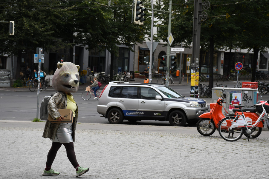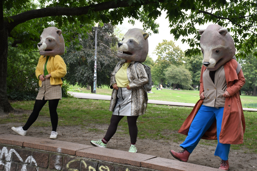 Bären werden kaum älter als 30 Jahre und können sich an die deutsche Teilung genauso wenig erinnern wie Millennials – so auch hannsjana. Also schlüpfen die Künstlerinnen in ihre Bärenkostüme und gehen den Vorurteilen und Privilegien auf den Grund, die in ihre west- bzw. ostdeutsche Sozialisation eingesickert sind. Sie wandern mit dem Publikum entlang der ehemals geteilten Brunnenstraße und suchen in einem performativen Audiowalk nach Spuren von Zugehörigkeiten, die gar nicht mehr so genau zu lokalisieren sind: Massiv veränderte Stadtbilder zeugen von den realen und ideologischen Planierraupen, mit denen alte Ideale mit aktuell geltenden Werten überschrieben wurden. Während die Zuschauer_innen über Kopfhörer den Erzählungen von critical westness und Ostwut lauschen, gibt es 30 Jahre nach dem Mauerfall noch einmal eine überraschende Wende.